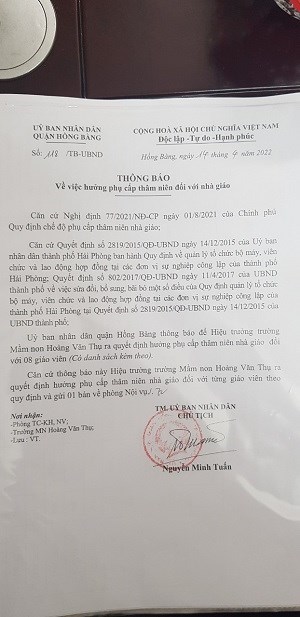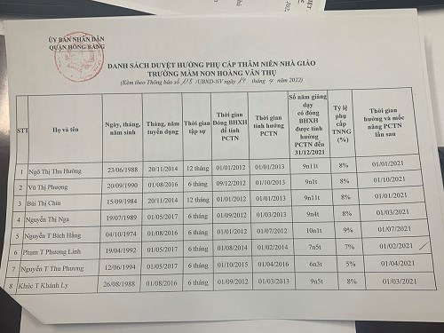 Trường Mầm non Hoàng Văn Thụ có 08 giáo viên được UBND quận Hồng Bàng duyệt cho hưởng phụ cấp thâm niên nhà giáo gồm: