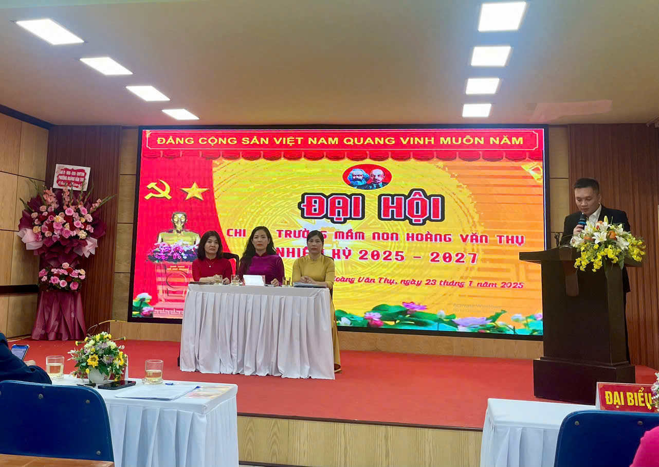 Thực hiện kế hoạch số 56-KH/ĐU ngày 12/08/2024 của Ban chấp hành Đảng bộ phường Hoàng Văn Thụ về tổ chức đại hội chi bộ trực thuộc nhiệm kỳ 2025 – 2027 và Đại hội đại biểu Đảng bộ phường lần thứ XIII, nhiệm kỳ 2025-2030; Chi bộ trường MN Hoàng Văn Thụ đã tổ chức Đại hội Chi bộ nhiệm kỳ 2025 - 2027. Về dự và chỉ đạo Đại hội có đ/c Đào Tuấn Anh - Phó Bí thư thường trực Đảng ủy phường Hoàng Văn Thụ, đ/c Phùng Thế Cường - Chủ tịch UB MTTQ Việt Nam phường Hoàng Văn Thụ, cùng 34/34 đảng viên trong chi bộ được triệu tập dự đại hội.