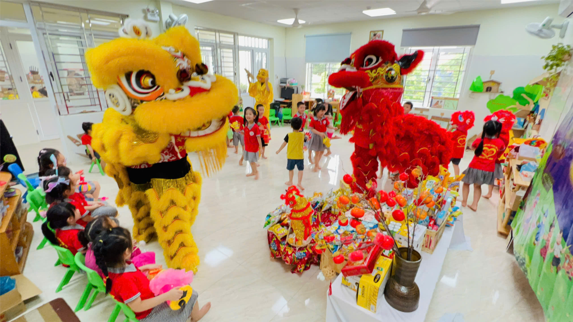 Trung thu năm nay do bị ảnh hưởng cơn bão số 3 Yagi, nhiều bạn nhỏ đang ở vũng lũ lụt vẫn chưa được đến lớp và đón một cái Tết Trung thu trọn vẹn, tuy nhiên các bạn trường Mầm non Hoàng Văn Thụ may mắn vẫn được đến lớp cùng các cô giáo làm đèn lồng, đèn ông sao, bày mâm quả trong lớp để đón Tết Trung thu thật đầm ấm.