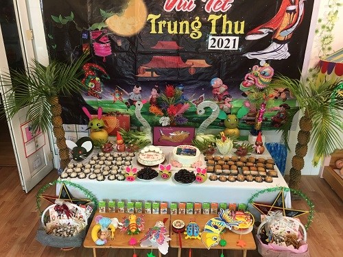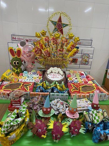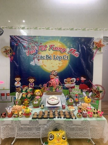 Các cô giáo cùng các bố mẹ của các bé vẫn bày những mâm cỗ dưới sân trường và trong các lớp với các hình con vật ngộ nghĩnh được tạo ra từ bàn tay của bố mẹ, cô giáo và các bé trông thật sinh động.