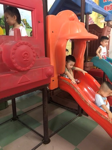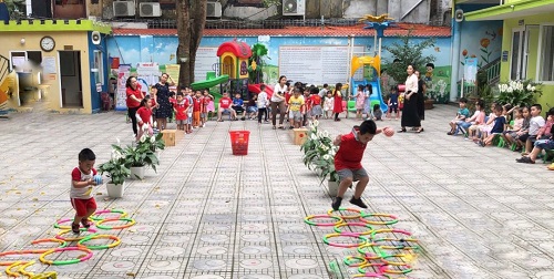 Ngay sau khi cô - trẻ trò chuyện, giao lưu là các bé được tham gia các hoạt động tập thể trong lớp như các bạn 4,5 tuổi tham gia một điệu nhảy dân vũ rửa tay, còn các bạn nhà trẻ và 3 tuổi thì được làm quen và chơi với các đồ chơi trong lớp cũng như ngoài sân trường.