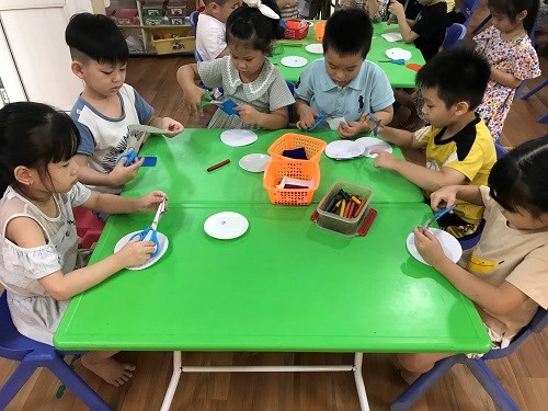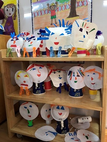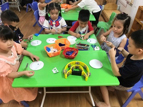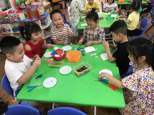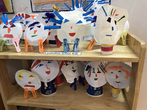 Thực hiện chủ điểm Bản thân, các lớp đã tổ chức cho các bé hoạt động như tạo hình, âm nhạc... về bản thân mình. Các bé lớp A2 đã được cô giáo hướng dẫn, với các nguyên liệu giấy màu, hồ dán, kéo và những nguyên liệu phế thải như cốc, đĩa nhựa dưới bàn tay của các bé đã tạo ra được những sản phẩm ngộ nghĩnh, rất trẻ thơ.