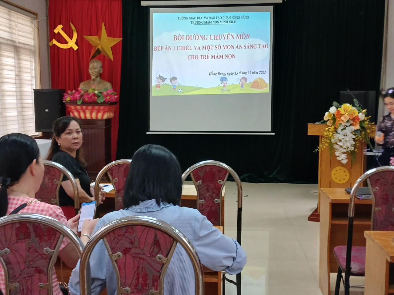 Ngày 15 tháng 9 năm 2023, đ/c Ban giám hiệu nhà trường cùng đại diện tổ nuôi tham dự Bồi dưỡng chuyên môn về qui trình bếp một chiều và một số món ăn sáng tạo do Phòng GD&ĐT tổ chức tại trường Mầm non Minh Khai.