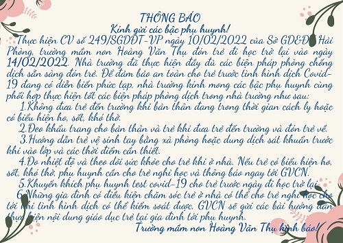 Thực hiện sự chỉ đạo của Sở Giáo dục & Đào tạo, Phòng Giáo dục & Đào tạo, nhà trường đã thực hiện đầy đủ các biện pháp phòng chống dịch và xây dựng các phương án sẵn sàng đón trẻ trở lại vào ngày 14/02/2022. Để đảm bảo an toàn cho trẻ trước tình hình diẽn biến dịch Covid-19 phức tạp, nhà trường kính mong các bậc phụ huynh học sinh phối hợp thực hiện tốt các biện pháp phòng dịch trong nhà trường như sau: