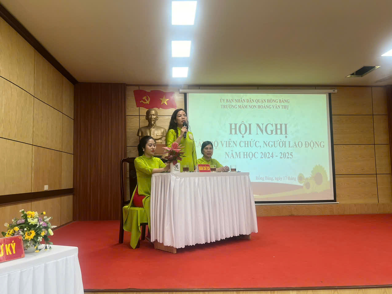 Ngày 17 tháng 10 năm 2024 trường Mầm non Hoàng Văn Thụ tổ chức Hội nghị Viên chức, người lao động năm học 2024 - 2025, tới dự có đ/c Vũ Thị Thu Hà - Phó Trưởng Phòng Giáo dục và Đào tạo quận Hồng Bàng, đ/c Thiều Thị Hà - Phó Chủ tịch phường Hoàng Văn Thụ, đ/c Nguyễn Thị Thùy Dương - Trưởng Ban đại diện Cha mẹ học sinh nhà trường, cùng 45 cán bộ, giáo viên, nhân viên nhà trường.
