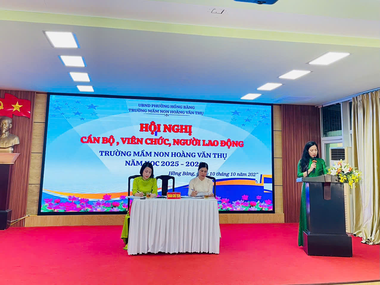 Thực hiện Công văn số 7074/HD-SGDĐ ngày 25/9/2025 của Sở Giáo dục và Đào tạo Hải Phòng; Hướng dẫn số 902/HD-UBND ngày 26/9/2025 của UBND phường Hồng Bàng; Công văn số 99/VHXH ngày 29/9/2025 của Phòng Văn hóa – Xã hội phường Hồng Bàng về Tổ chức Hội nghị cán bộ, viên chức, người lao động năm học 2025 - 2026; Trường Mầm non Hoàng Văn Thụ đã tổ chức Hội nghị Cán bộ, viên chức, người lao động năm học 2025 – 2026. Tới dự có đ/c chuyên viên Phòng Văn hóa - Xã hội phường Hồng Bàng, Trưởng Ban đại diện Cha mẹ học sinh trường cùng toàn thể 47 đ/c Cán bộ, giáo viên, nhân viên nhà trường.