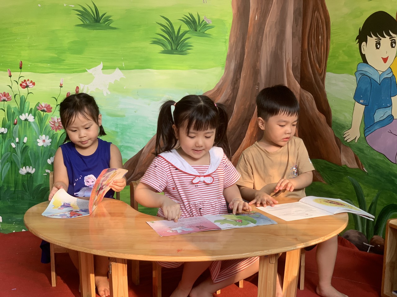 Một số hình ảnh của các bé tham gia đọc sách truyện cùng các bạn, ông bà, bố mẹ hay là các bé mang cây xanh để đổi sách truyện...