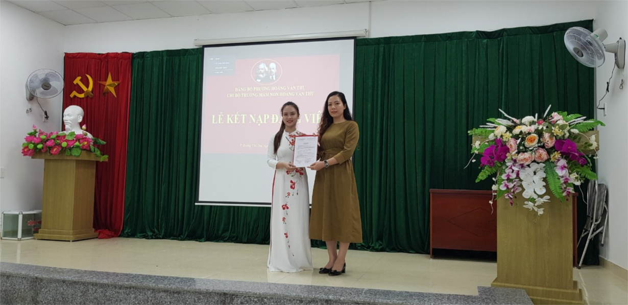 Thực hiện Quyết định số 1782/QĐ-QU ngày 24/11/2023 của Quận ủy Hồng Bàng về việc kết nạp đảng viên, Chi bộ trường Mầm non hoàng Văn Thụ đã tổ chức kết nạp đảng viên cho cô giáo Nguyễn Thị Thu Hà, đ/c Đinh Thị Thanh Hiên - Bí thư Chi bộ, Hiệu trưởng nhà trường đã trao Quyết định và giao nhiệm vụ cho đảng viên mới Nguyễn Thị Thu Hà.